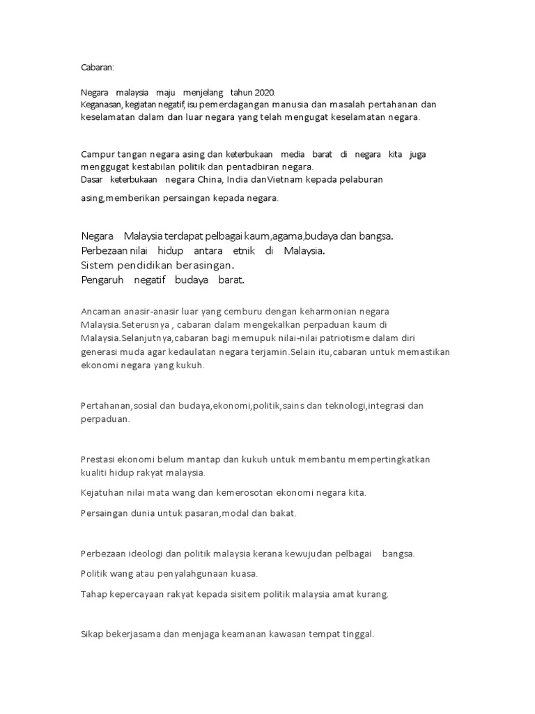 Masalah mengekalkan partriotisme. SPM 2011 Mengekalkan kedaulatan negara sebagai sebuahnegara yang merdeka Mengekalkan pemerintahan sendiri Bebas menentukan hala tujunegara mengikutacuan sendiri Mempertahankan hakdanmaruah bangsa Mengekalkan kebebasan tanpa dikawal kuasa luar Melindungibudayabangsa negara Menjamin kesejahteraan hiduptanpa ditindas Mengekalkan. Berdisplin - mempertahankan dan menjunjung Perlembagaan Negara - mematuhi peraturan dan undang-undang. Berdasarkan Nurfatimah 2008 menurut Kamus Dewan edisi ketiga 1998 perpaduan bermaksud penggabungan peleburan persesuaian kecocokan perihal berpadu bergabung menjadi satu sepakat dan lain-lain.